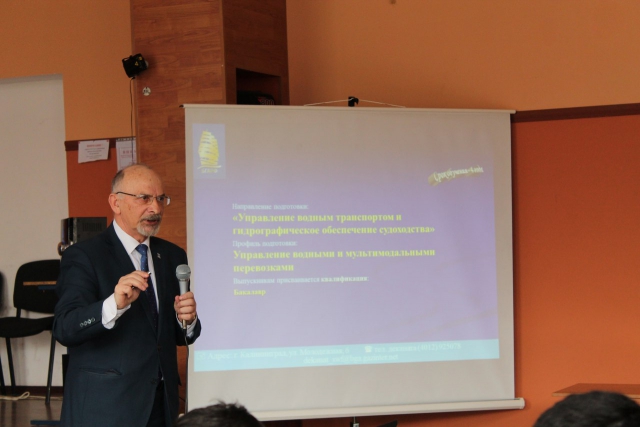 4 апреля в актовом зале Лицея № 7 состоялась встреча выпускников школ округа с профессором Балтийской государственной академии рыбопромыслового флота ФГБОУ ВО "Калининградский государственный университет" Мейлером Леонидом Ефимовичем. Цель такого рода встреч - профессиональная ориентация старшеклассников, знакомство с возможностями дальнейшего обучения.