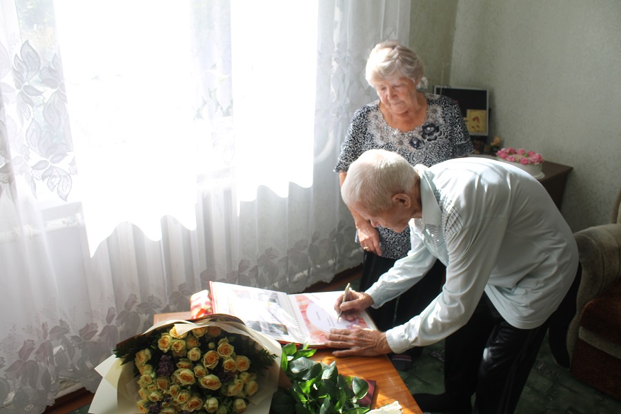 Сергей Булычев вручил юбилярам поздравление губернатора Калининградской области Антона Алиханова, букет белых роз и небольшой подарок. В поздравлении главы региона в частности сказано: "Пусть ваш прекрасный союз здравствует вопреки времени и на радость близким, а, помимо этого, служит примером для подражания всем молодоженам Калининградской области. Пусть дети и внуки всегда и во всем будут вашими помощниками, а подрастающее поколение правнуков радует вас своими успехами. Желаю крепкого здоровья, благополучия, мира, гармонии, огромного счастья вашей большой и дружной семье! Пусть каждый день вашей жизни будет светлым и радостным!"